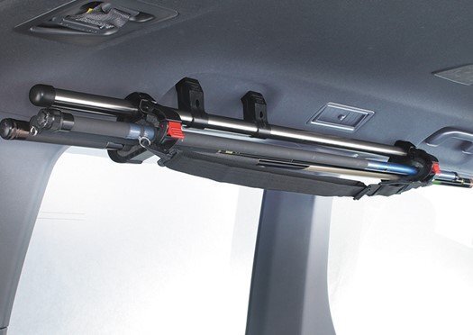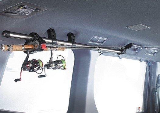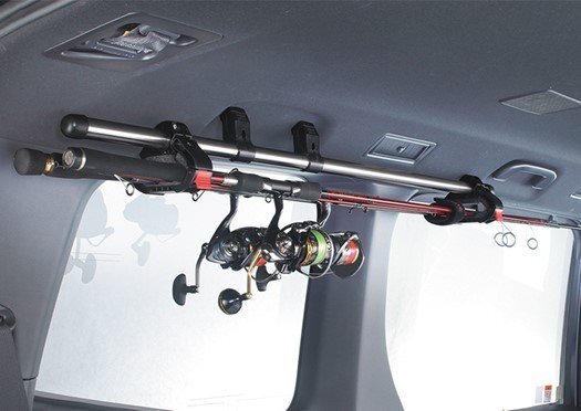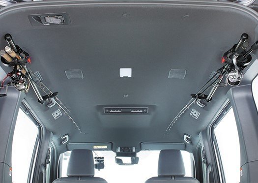 Using the 1-piece front holder and lightly resting the rod tips against the ceiling, you can store two trout rods with reels attached.