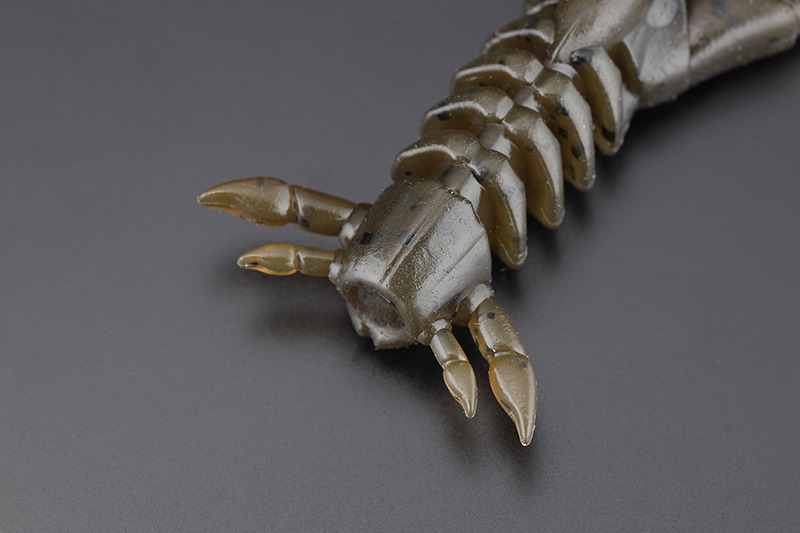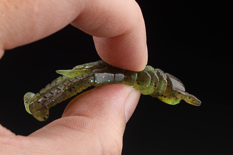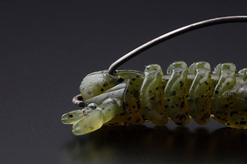 The shad tail shape of the toe firmly scrapes water when "rolling", making it appealing. The arms are thick and have a strong presence, but the slits are placed in different directions on the top and bottom to allow for flexible movement. By "stopping" after landing on the bottom or after an action, when the worm falls down from a vertical position, it firmly pushes the water and induces a bite. It combines the two elements of "winding" and "stopping" at a high level, making it ideal as a pilot worm.