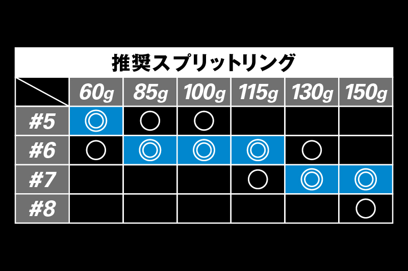 60/85g = 3/0、100/115/130g = 4/0、150g = 5/0