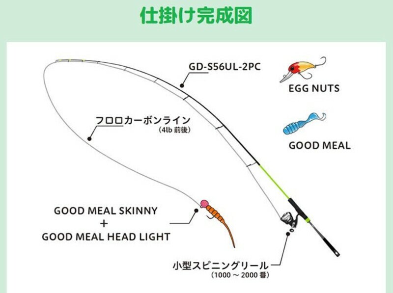 This rod can be used for lure fishing at embankments with low footholds for sea fishing, and managed fishing spots and rivers for catching freshwater fish. The rod is soft and bends, making it suitable for throwing light lures. If you set a spoon or small crankbait, you can target rainbow trout in managed fishing areas or gobies in rivers, or if you set a skinny fish on the embankment, you can target horse mackerel and halfbeak. Since it is a 2-piece type rod, it is ideal for loading into a car or traveling on public transportation.