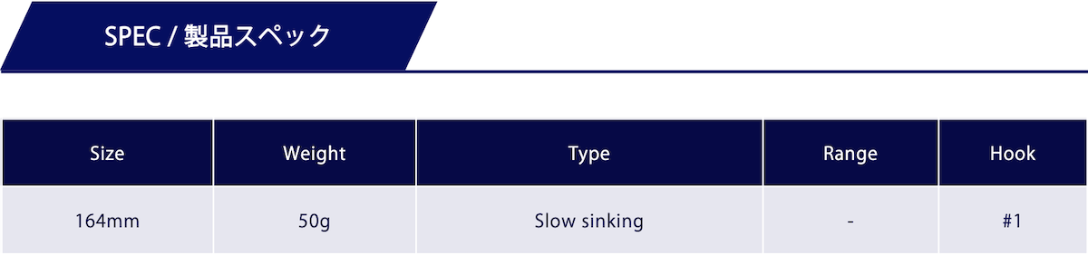 Since it is a slow sinking model that weighs 50g, it is suitable for fish of all depths, and it can also give a long distance.