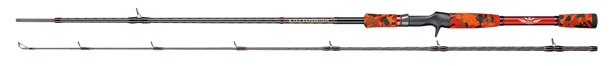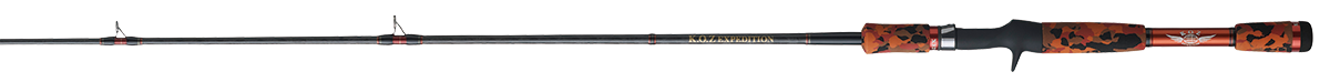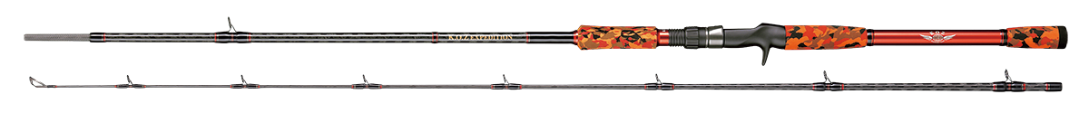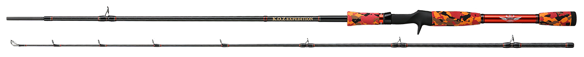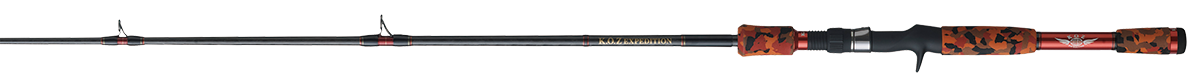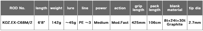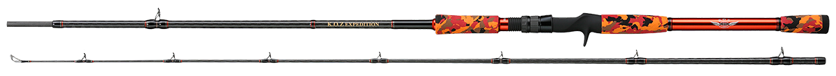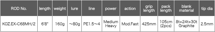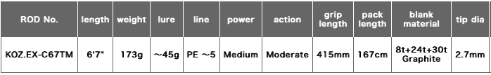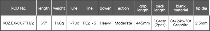 Based on the KOZ.EX-C67TM, this model was converted to 2pcs for better storage. More torque from the belly to the butt section. It can be used for a wide range of top water plug sizes, starting with catfish top water game. All guides are made of titanium frame SiC-S.