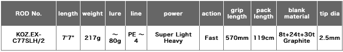 The C77SLH was originally developed for targeting rockfish from the rocky shore or from a boat. The grip length was set to be easy to handle, but still long enough to be cast from the shore. Since Bekko zoi are often fished in seaweed, we sought for a rod hard enough to hook the lure firmly even when it is bitten in the seaweed. The rod is designed to catch and fight the pull of fish trying to dive into reefs. This rod is not only stiff, but also can be bent to cast and fight, making it easy to use for big baits for sea bass and redfish. I have also caught pirarucu and tarpon with this rod.