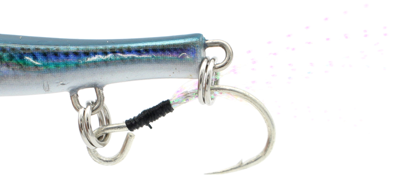 The curved left-right asymmetrical real shape that gives a feeling of life, the irregular reflection of the surface due to the shape, and the silhouette at the time of fall. They make Metal Adict-03 appeal naturally. Adopts a semi-fixed large tinsel hook mounting system with two eyes on the rear that allows you to mount a large hook and set the hook closer to the main unit. The biggest feature is that it can be used with a large hook, and eliminates the entanglement between the line and the hook. By removing the rear hook, it is possible to perform irregular actions like a general metal jig.