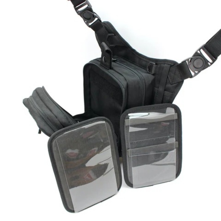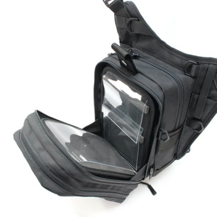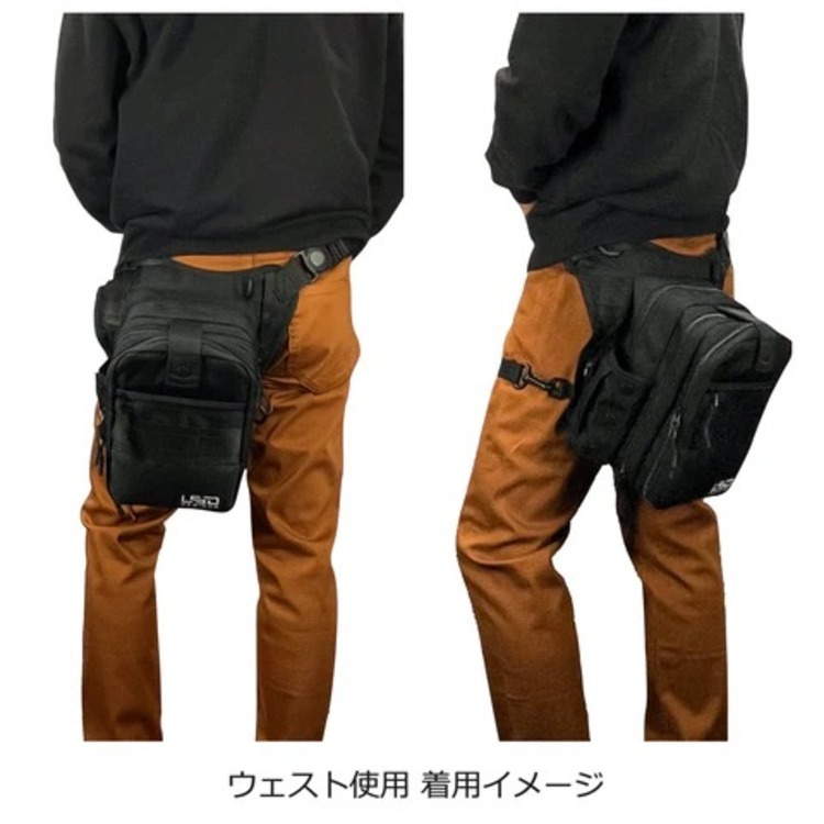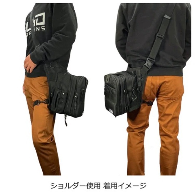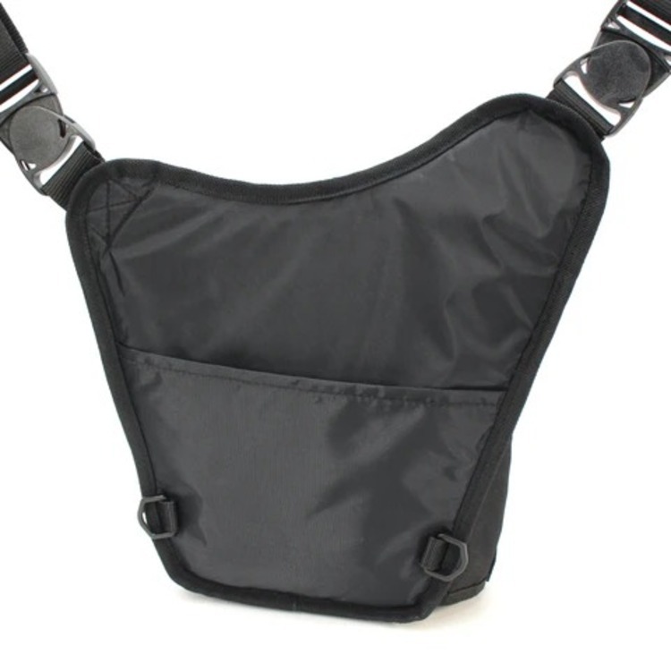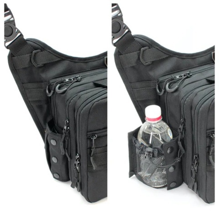 Adjustable shoulder strap allows for shoulder, leg, or waist carry