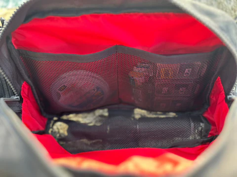 The interior of the pocket features a red lining for enhanced visibility inside the bag.