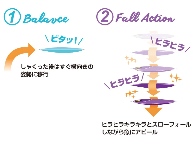Its bite-sized body is especially effective when the prey is small or the fish is reluctant to bite. When action is applied, it immediately shifts to a horizontal position as shown in (1), and while flashing, it activates a fluttering slow fall as shown in (2).