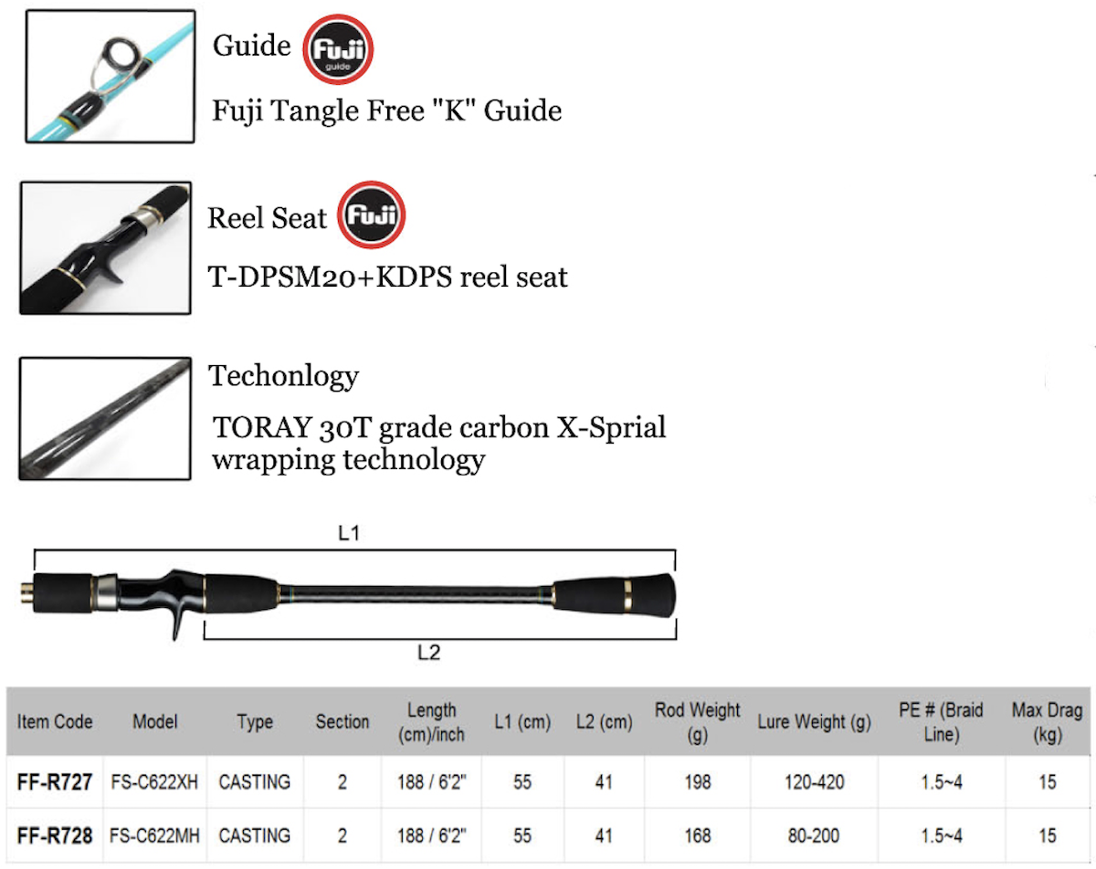 It designed to enjoy slow pitch jerk. Easy to handle jigs from 80~240g. Enabling to feeling/tension of jig and enjoy the technical game fishing. Effective for various type of fishing. Rod blank is built of Japan TORAY 30T grade carbon X-Spiral wrapping technology offers best light weight and strength at performance. Fuji Tangle Free K Guide and DPS reel seat offer best durability.