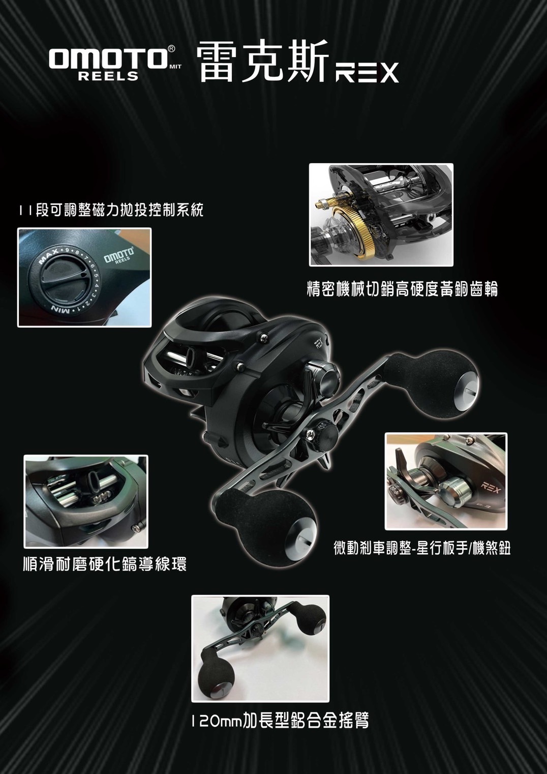 REX 雷克斯,OMOTO新款梭型大物捲線器,適合雷強、魚虎、石斑等。加大握丸,120mm加長鋁合金把手,力剋大物更加游刃有餘。