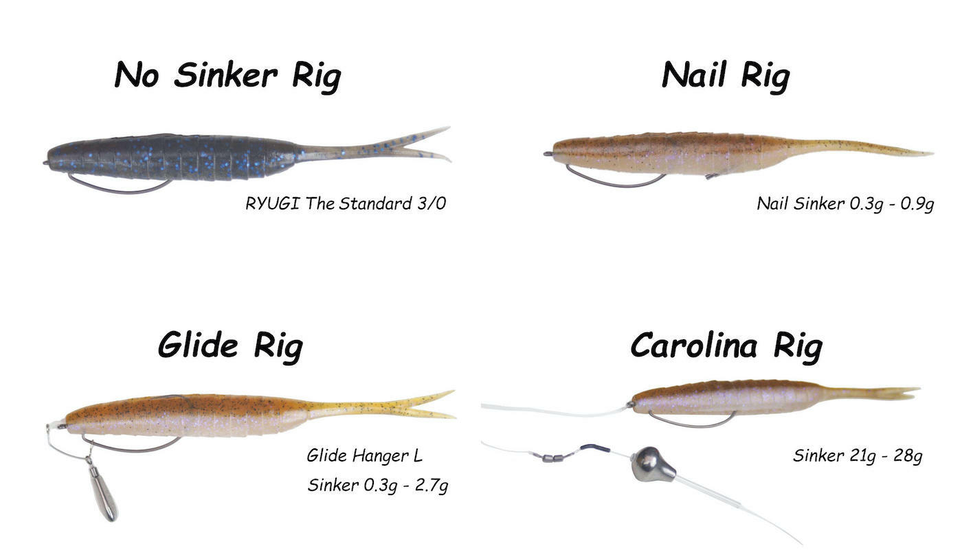 Furthermore, if you want to use it near the bottom, or if you want to make it act firmly in strong currents, try using a nail rig with an inserted weight of about 0.3g to 0.9g.