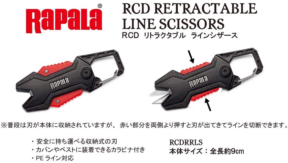 Safety takes priority when it comes to the RCD Retractable Line Scissors. Two super sharp stainless steel blades retract into the surrounding casing when the triggers are released, only exposing the blades when in use. A built in carabiner allows you to keep these scissors close by at all times. Item lenght 9 cm.