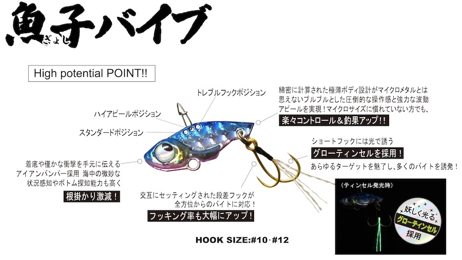 The micro metal game is characterized by its ability to catch anything, mainly horse mackerel and rockfish. However, due to its light weight, it has traditionally had a problem of being difficult to use. To overcome this problem, the "Uko Vibe" was born. It has an overwhelming feel when used and a strong vibration that attracts fish!! It can be said to be the ultimate light item.