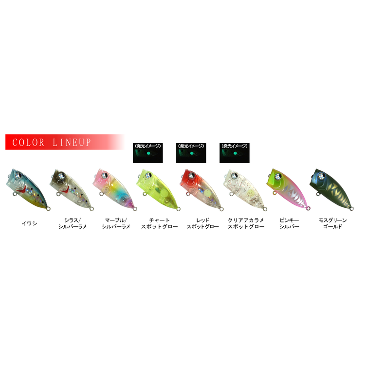 Just lower the rod and reel the handle in half to one turn to create the pop and splash that rockfish love. It will appeal to a wide range of targets, and you can just wait to catch it! Comes standard with a glow cup that lets you see the action, a red hook with a high stealth effect, and a glow tinsel that acts as a bite point!!