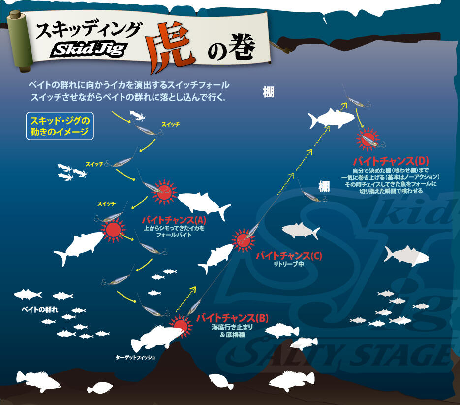 Skidding method! The naming taken from the method "skid" and "squid" of "skid" and "squid" of the method created by the assist club Akiyama, as the name suggests, is the image of the live bait of squid, Achieving an innovative movement that moves in a straight line, avoiding vertical rotation and horizontal slide during both winding and falling.