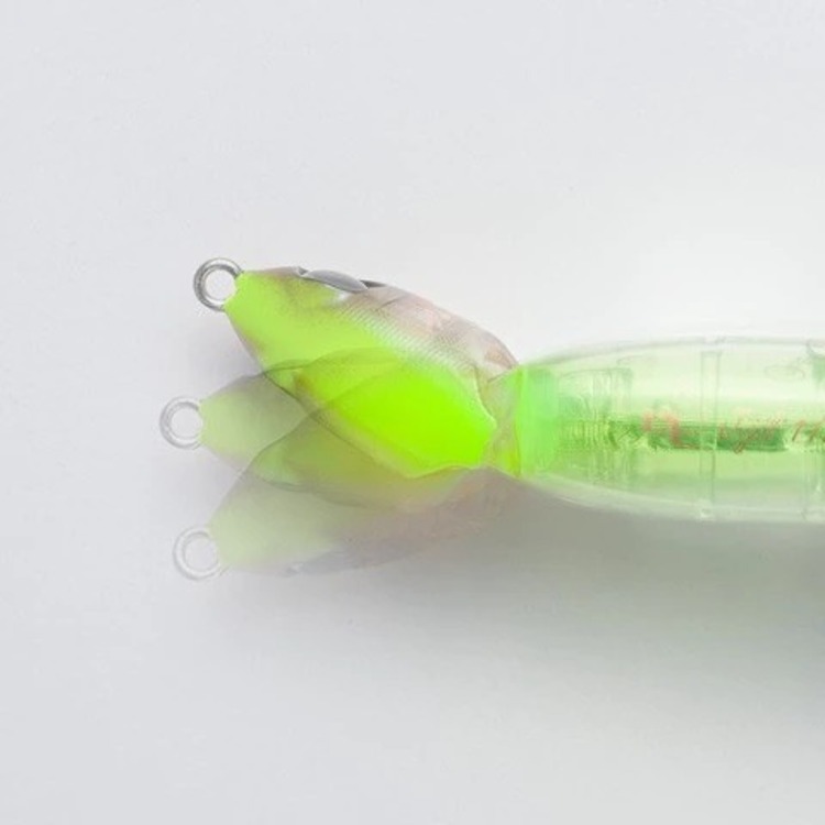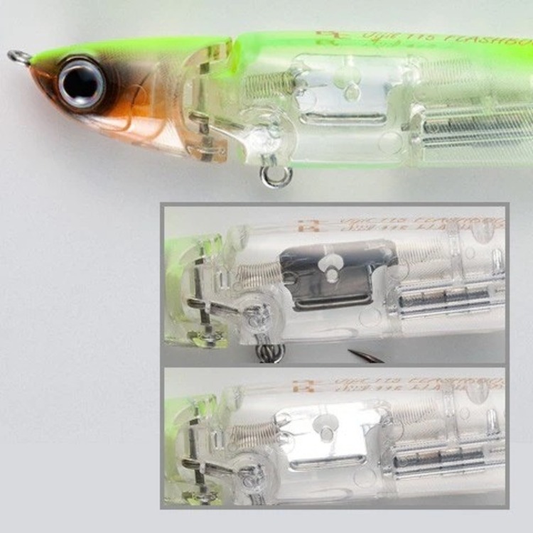 The FLASHBOOST uses a spring mechanism inside the lure to suspend and fix the reflector. Vibrations from rod handling and other actions drive a spring that vibrates, transmitting the vibrations to the reflector. Even when the lure stops floating, the reflector continues to flash, attracting fish.