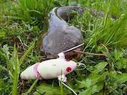 Based on a crawling action in which the lure swims as if it were gouging deeply while hitting the surface of the water with its wings. This action is inherited from the well known action of the Batapee, and is effective in wavy conditions where cup type plugs are not good.