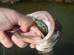 大久保幸三專門為鱸魚設計的空心蛙, 用來攻克障礙, 穿越水生植物覆蓋區時表現出色。