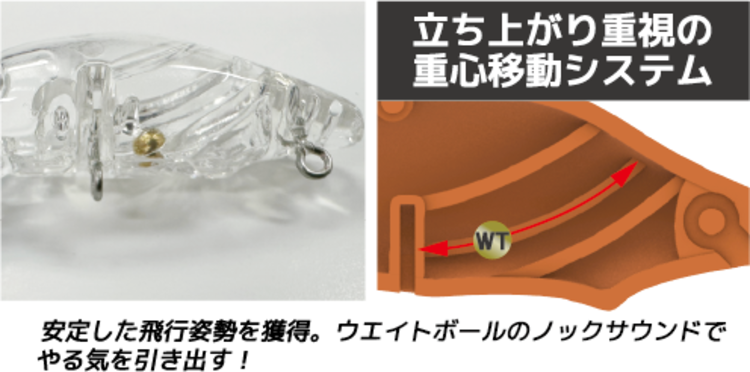 The internal chamber is shaped like a Japanese “ノ” character, ensuring the weight ball always returns to the correct position right after landing. This secures both casting distance and immediate action start.