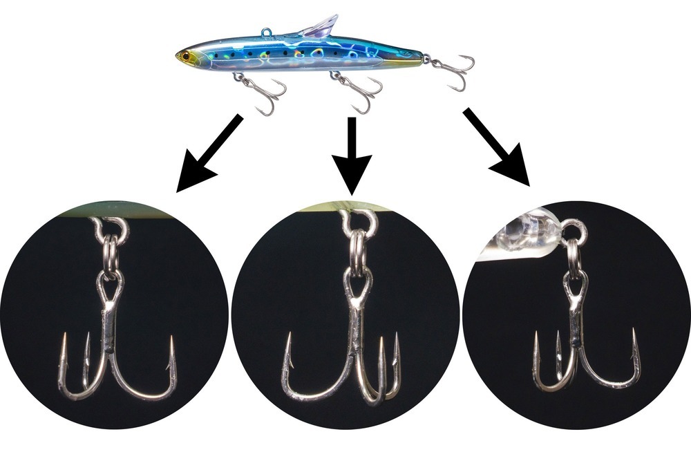 Upon shipment, the front treble hook is set in an inverted direction (with two hook points facing forward toward the head). This setup is based on field test results, and the same orientation is recommended when replacing hooks.
