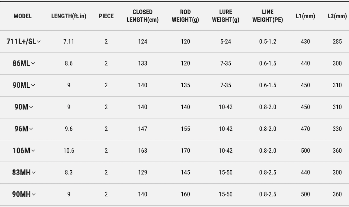 The bigger guides are equipped for longer casts. 83MH and 90MH are especially powerful rods that are useful to catch Barracuda as well. The selected specifications are good for other fish such as perch, zander, pike.