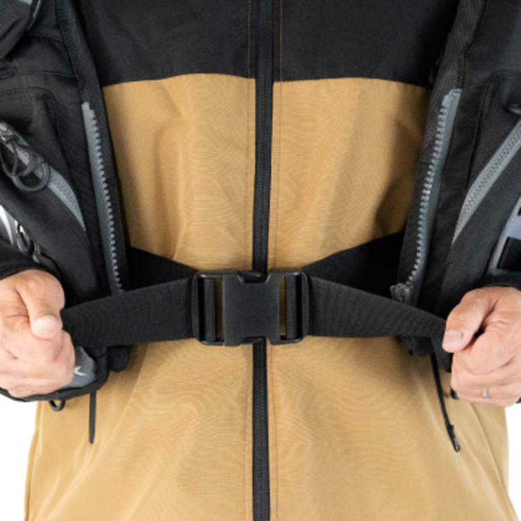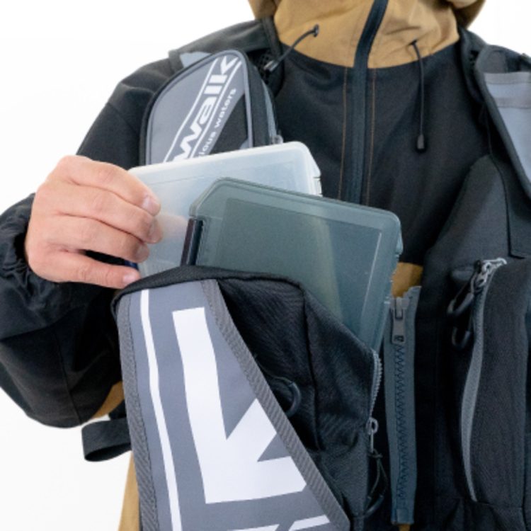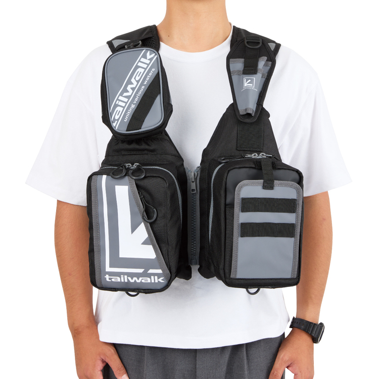 A floating game vest packed with the functions required for shore games. There are ample storage spaces, including pockets on both sides of the front that can store two VS-3010NDMs stacked together, and a large pocket on the back with top and bottom zippers for easy access. If you fit it to your body with the belt located on your waist, you can fully utilize the storage space and adopt a load distribution structure that is less tiring all day even when the load is heavy, and reduce localized strain on your shoulders. In addition, by eliminating the crotch belt and equipping it with a thigh belt, you can wear it more stylishly while ensuring safety (the thigh belt can be attached to the side belt when not in use). It also comes standard with a removable smartphone-sized pouch and pliers holder, making it an item packed with specifications that allow anglers to fish for long periods of time without stress.