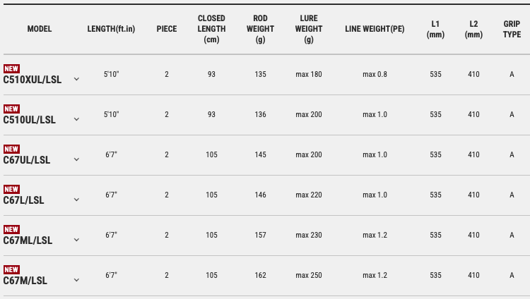 竿尖部分採用兼具柔韌性與強度的碳纖全實心結構(Full Solid),而竿身(竿尾)則採用在高負荷時展現強大韌性與回復力的玻璃纖維複合管狀結構(Glass Composite Tubular)。