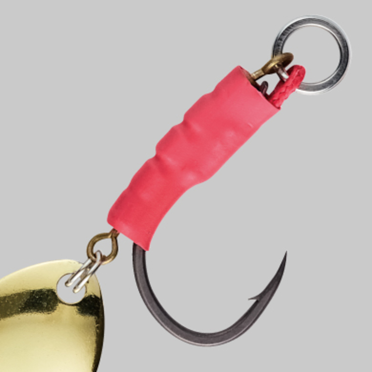 STATIONARY BLADED HOOK The blade is fixed to the hook using heat shrink tubing so that it is attached to the shank via a tiny swivel. By adopting this method, it is possible to lure by turning only the blade without the hook moving wildly.