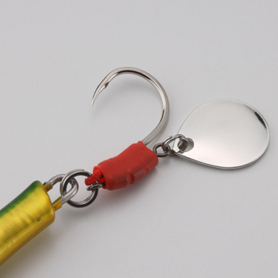 19cm blade is equipped on rear hook. The blade is connected not directly to the hook but to the tiny swivel so only the blade rolls without hook’s roll. The color of blade is different depending on the body color to take a contrast.