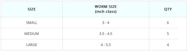 S is used for 3-4 inch worms, M is used for 3.5-4.5 inch worms, and L is used for 4-5.5 inch worms.