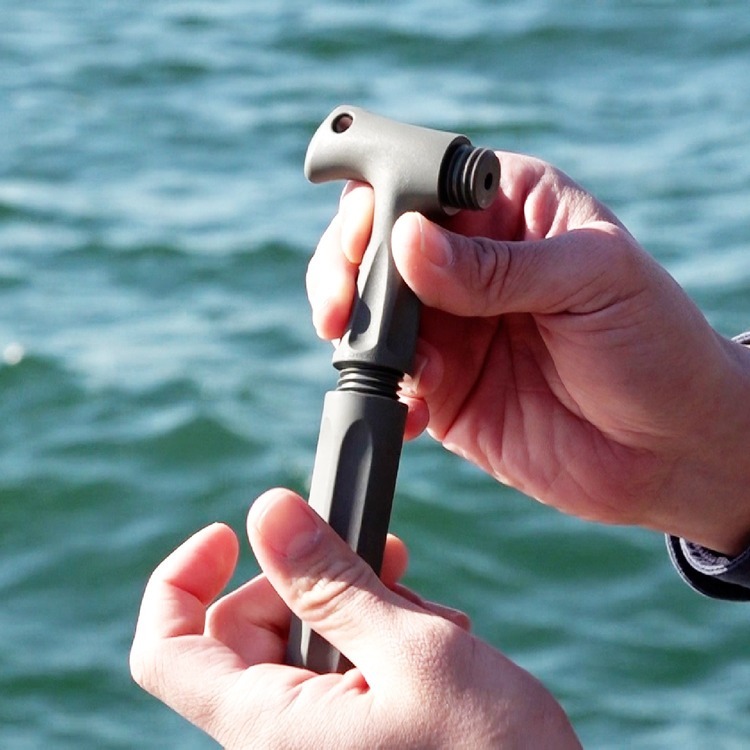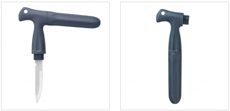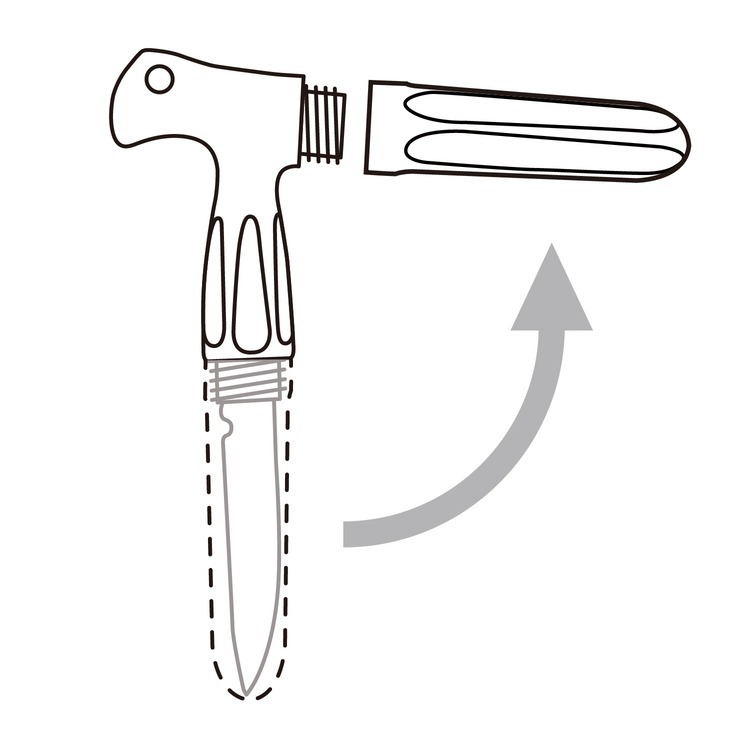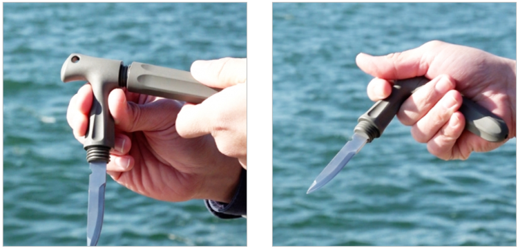 The cap can be attached to the grip to form a T-shaped handle, allowing a firm grip for powerful stabbing.