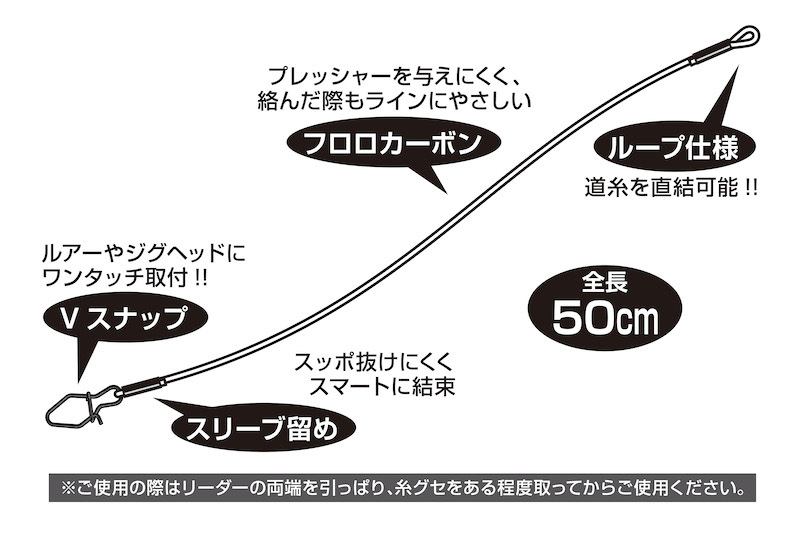 特粗的碳纖前導線減少因有銳利牙齒的魚類而斷線, PE線能夠容易的直接連結, 不會浪費時間綁線, 比起鋼絲線, 讓於比較不會有壓力及警覺性, 較有彈性, 不容易糾纏及容易操作使用