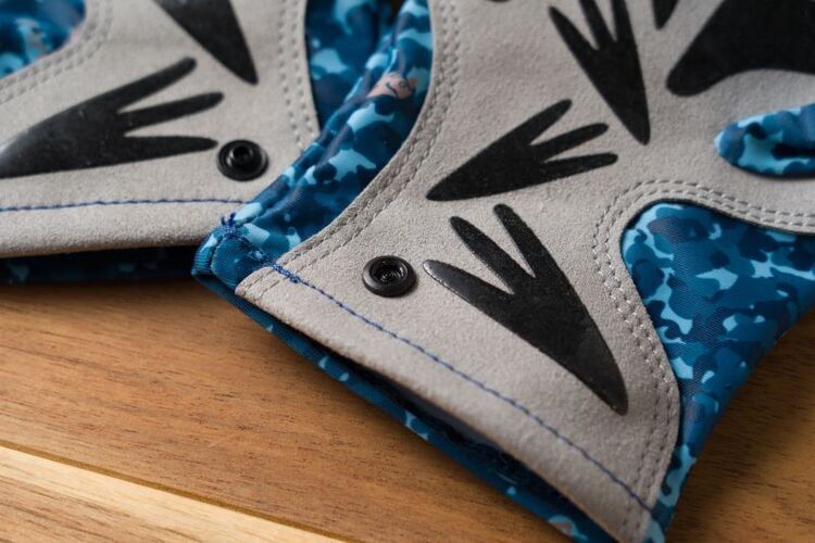 並在手背指關節處橫向配置了合成麂皮,用來減輕在綁子線或拉線時,線咬進手指的痛感。
