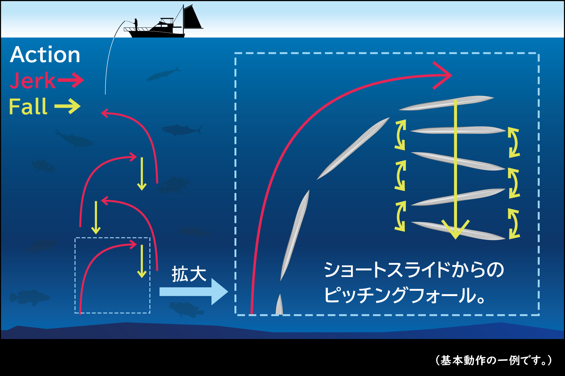 特有的帶凹槽頭部形狀,能牢牢在水中產生阻力,即使輕輕地抽動也能產生側向落下動作。 乍看之下動作似乎簡單,但這不會驚動魚兒,因而被吸引來就餌。 在強烈的抽動之後,產生釣線鬆弛的空擋,就會實現長滑行的動作。 其重心位置略微向前,這使得路亞可以向後滑動,然後在提升和下降動作中轉向側面。 下落動作是通過頭側邊的形狀來控制,像船的龍骨一樣起到抑制側傾的作用,所以鐵板落下時帶有俯仰傾斜的動作(見下圖動作)。
