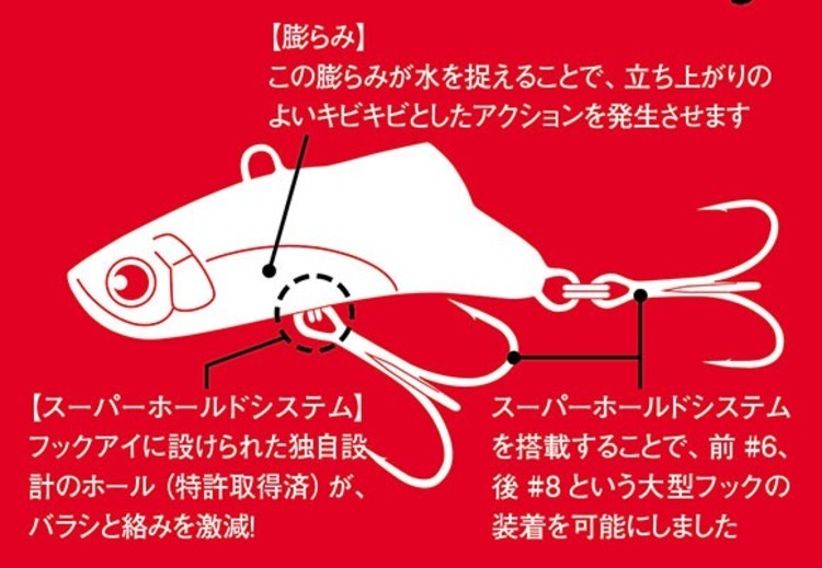 藉由腹部的膨脹設計抓住水流,讓這款超小尺寸仍能呈現俐落靈敏的動作,同時保持優秀的切水性、減少重拖感,帶來輕快順暢的收線手感。搭配驚人的飛行距離,可以有效率地搜索大範圍,是一款極高回收率的微型震動餌(Vibration)。