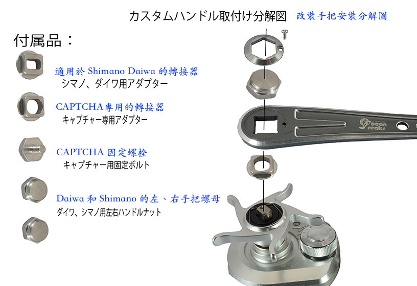 改裝手把可安裝在三種品牌的捲線器上--Ocean Freaks TECOMAX 3600,CAPTCHA 系列、SHIMANO 和 Daiwa。