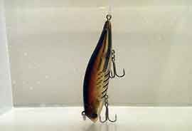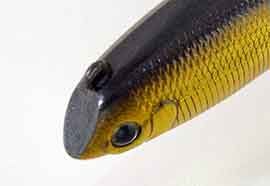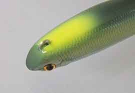 頭部模擬真實魚類配色,並噴上螢光黃色作為指示記號,便於肉眼追蹤路亞動作與掌握咬合瞬間。