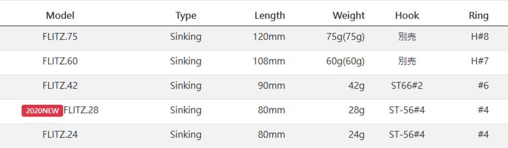 75g / 60g / 42g has the same specifications as WORKS175 (1.2mm thickness), and 28g / 24g also uses a 1mm thick laser cut penetrating wire. In addition, it is a heavy-duty specification with a super hard coating that is resistant to hook scratches and sharp teeth of big fish. The 80mm "24", which pursues action performance in the low speed range, also matches sea bass games and flatfish games. The flight distance and bite-sized silhouette that surpass those of ordinary minnows are a great advantage.