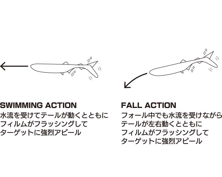如其名,特徵是尾部會強烈擺動,即使在超慢速(Dead Slow)或下沉途中也能穩定產生 Wobbling+Rolling 的游動動作。神尾翼搭載的薄膜會發出強力閃光,帶來強烈的誘魚效果。