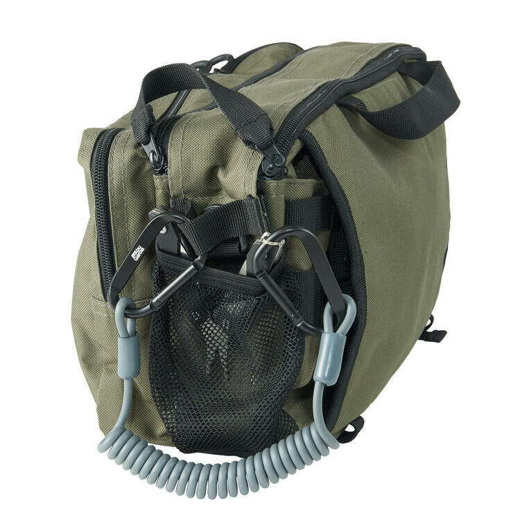 兩側附有印有標誌的登山扣,可以安裝在包包或釣具上。具備彈性且恢復性高,非常適合防止鉗子等工具掉落。