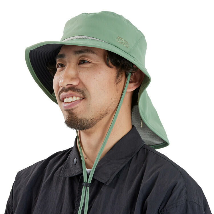 當風大或日曬較弱時,後方的帽沿可以捲起並用帶子固定。帽子配有下巴調節帶,帽身調節則使用彈性繩,即使在風大時也能安心佩戴。帽子本體設有網狀通風口,能有效散熱。