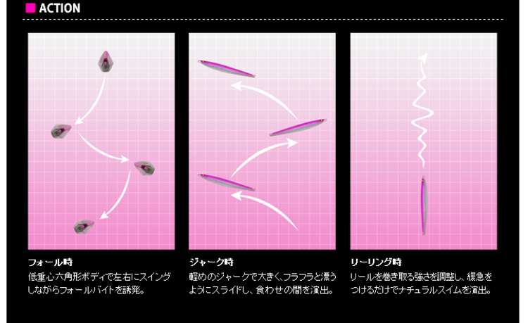 在收線操作時加入變化,會展現出誘人的游動姿態;大幅度的抽動則會使其鋒利地左右逃竄,吸引魚隻。