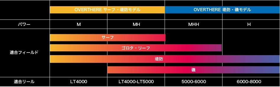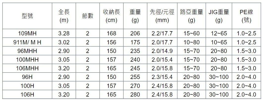 MHH:為MH的高強度版本,竿身強度更高可進行更高強度的作釣,導環也更改為全雙腳的導環,握把和捲線器座的位置也設計為更適合進行高強度博魚