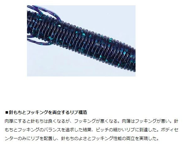 增加厚度可以提高鉤子固定性,但會降低貫穿軟蟲的著鉤能力。為追求鉤子固定和著鉤性能的平衡,設計了細密的肋骨。只在身體中央部位設置了肋骨,實現了鉤子固定和著鉤性能的雙重兼顧。
