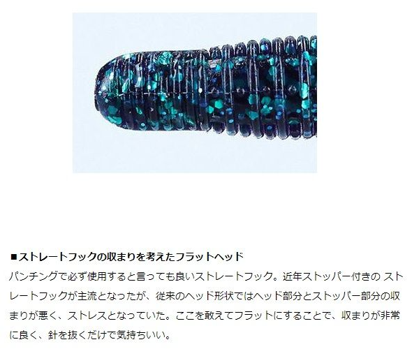 可以說直鉤在punching技法中必不可少。近年來,直柄軟蟲鉤帶有固定功能的止動器(stopper)的已成為主流但傳統的頭部形狀與止動器之間的適配性不佳。通過將頭部設計為平頭,使得配合更加緊密。