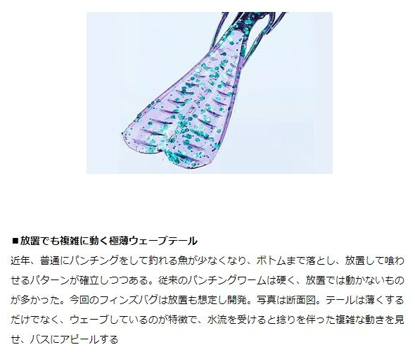 近年來,使用常規punching技法來釣魚的機會越來越少,現已確立了將誘餌投放至底部並靜置的模式。傳統punching軟蟲比較堅硬,靜置時動作較少。而本款Finz Bug則充分考慮了靜置時的表現,研發而成。照片顯示了剖面圖。尾部不僅非常薄,而且呈現波浪狀,受到水流的影響時會產生扭曲的複雜運動,吸引住鱸魚。