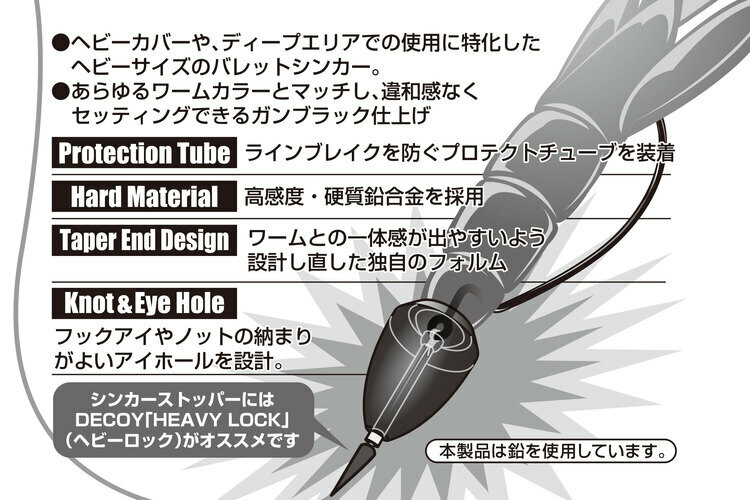 針對攻克有較厚重覆蓋物的情況,專用於使用重型德克薩斯釣法使用,設計的最大1.3盎司(約36.85克)的重型子彈形狀鉛錘。