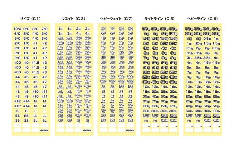 「WEIGHT」...標示常用的重量,最高可達1盎司(約28克)。同時顯示克/盎司的數值。適用於鉛錘、帶鉤、假餌等。