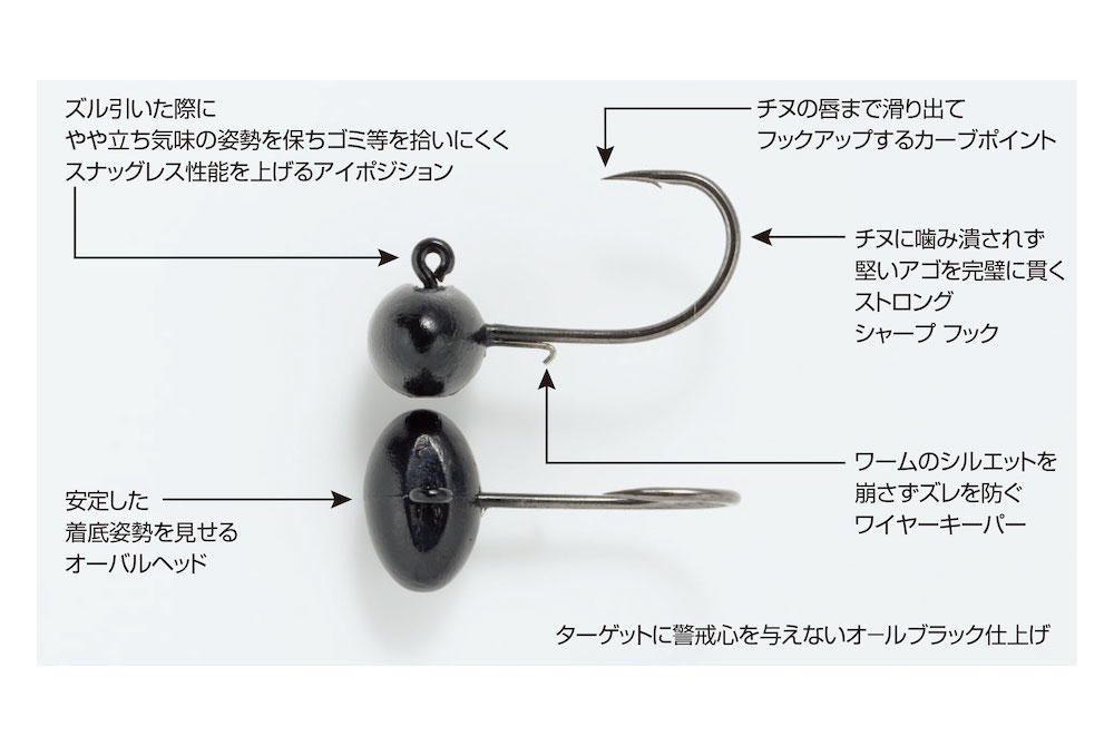 完全配合螃蟹形狀, 在水底與激起煙塵與泥沙的摩擦吸引著黑鯛, 特別採用短, 強壯且銳利的鉤子, 讓黑鯛好入口且好貫穿, 不會被黑鯛強壯且堅硬的嘴給壓碎, 鉛頭的形狀能穩定地著陸在海床上, 除了黑鯛, 其他的根魚或是石斑, 也是喜歡吃螃蟹的