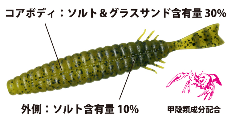 將鱸魚最喜愛的蝦和小龍蝦等甲殼類粉碎後生成的甲殼類成分,混合進了高拉伸強度和良好持鉤性的超軟材料中,以強烈刺激鱸魚的味覺和嗅覺,從而提高誘魚效果和咀嚼時間,使黑鱸更容易吞食並鉤住。此外,核心部分包含細粒且高比重的自然界提取的玻璃砂與鹽混合。