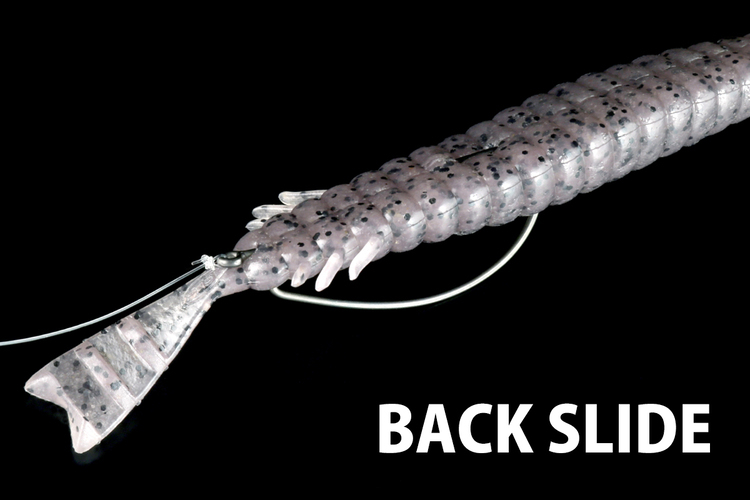 細長平坦的身體受到水流阻力,形成緊湊且下落速度快的獨特螺旋下落動作,對於習慣單調下落動作的鱸魚具有高度吸引力,能誘導咬鉤。此外,在底部跳躍或上提和下落、抖動時,細長的身體彎曲放出水壓波動,模擬底部的泥鰍和甲殼類,誘發咬鉤。